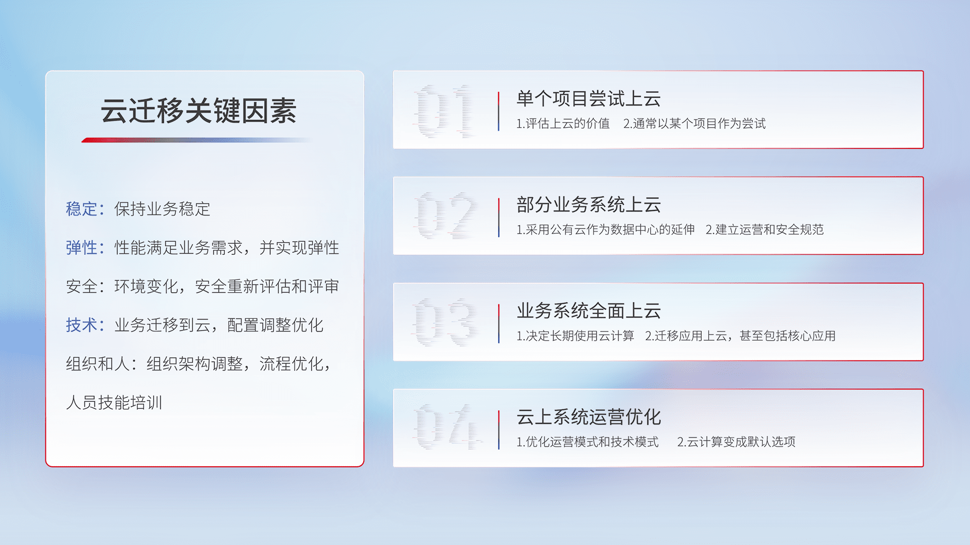 结合实际业务,,从规划设计、、、、云平台选型、、、云原生改造、、、、数据迁移、、集成交付,,,迁移全过程为客户识别最佳上云路径,,,做好风险识别管理,,,设计网络架构、、、身份权限、、、安全审计合规、、、操作审计、、日志审计、、、监控告警策略、、多站点容灾设计等,,对云上基础设施进行整体规划,,,,提升IT治理水平,,以满足弹性、、、、高可用、、、高性能的需求。。。。