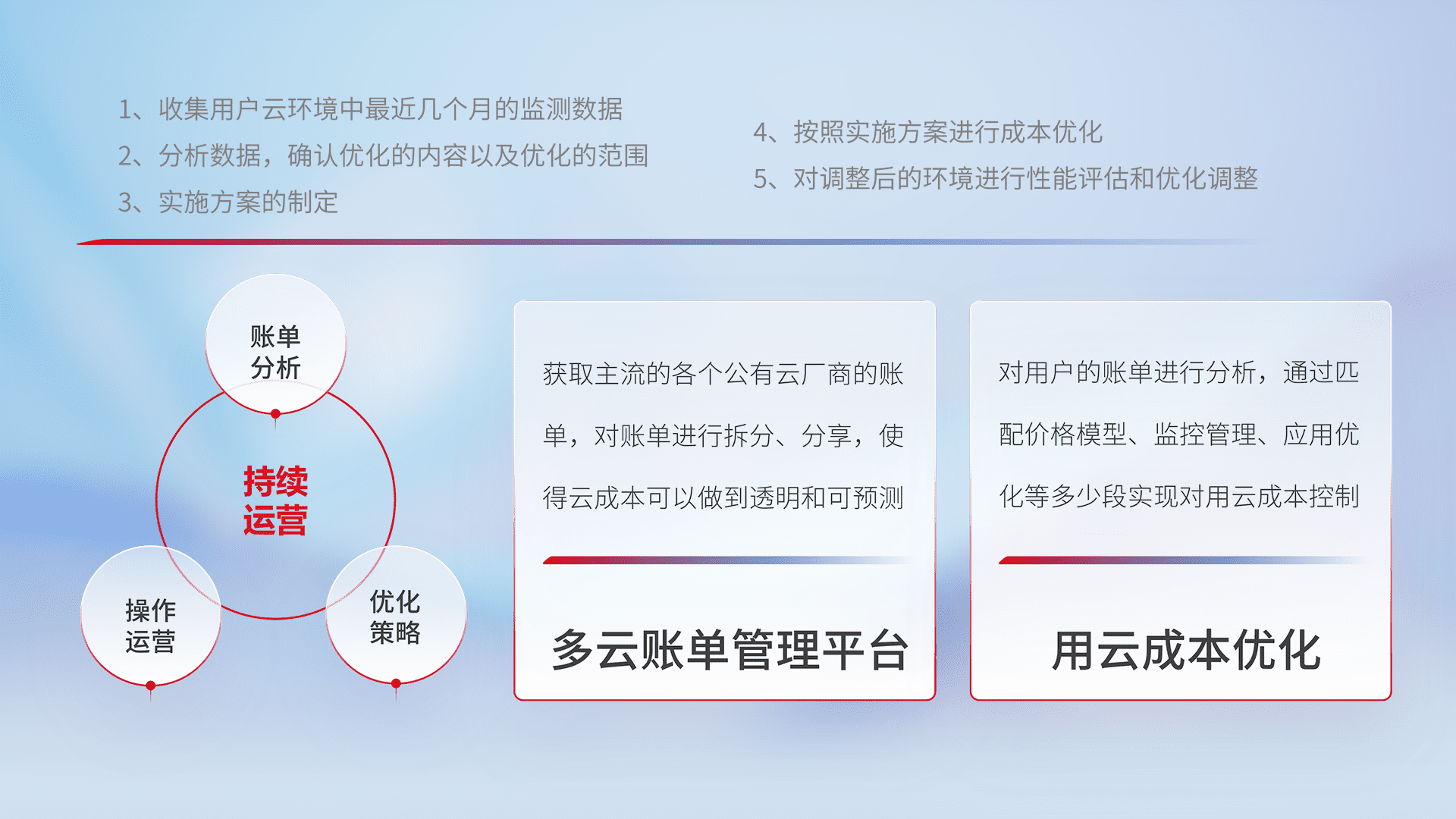 通过多云纳管,,以统一的资源数据模型把客户的云资源进行抽象和封装,,,,进而实现对多云资源的统一操作,,,,保障云资源管理的可靠性、、、稳定性与可用性。。。。量身定制化运维内容,,,,配置、、、开发运维、、补丁管理、、、、备份、、、、监控、、、、认证和访问管理、、、审计和日常巡检等,,保障在用云过程中的可靠度,,,,稳定度以及高可用率。。。。